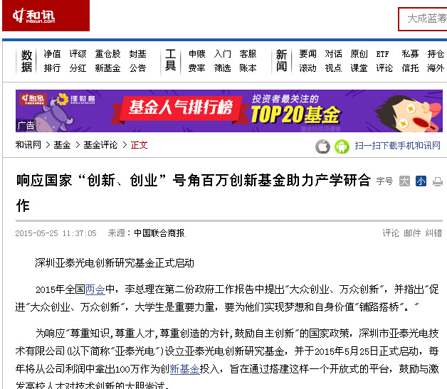 為響應(yīng)"尊重知識(shí),尊重人才,尊重創(chuàng)造的方針,鼓勵(lì)自主創(chuàng)新"的國家政策,深圳市亞泰光電技術(shù)有限公司(以下簡稱"亞泰光電")設(shè)立亞泰光電創(chuàng)新研究基金,并于2015年5月25日正式啟動(dòng),每年將從公司利潤中拿出100萬作為創(chuàng)新基金投入,旨在通過搭建這樣一個(gè)開放式的平臺(tái),鼓勵(lì)與激發(fā)高校人才對技術(shù)創(chuàng)新的大膽嘗試。