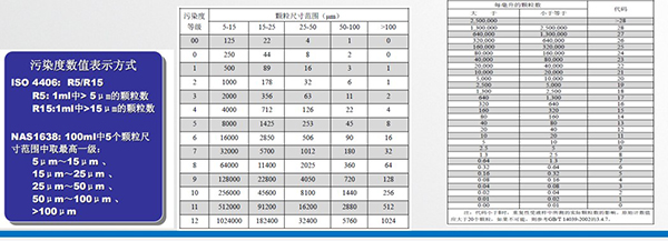 油液污染度常用國際ISO4406-1999污染度等級標準表示,它是以1ml潤滑油中顆粒數來表示,采用三個數碼代表污染度等級,前一數碼代表1ml油樣中尺寸大于4 μm的顆粒數等級,中間的數碼代表1ml油樣中尺寸大于6 μm的顆粒數等級,最后的數碼代表1ml油樣中尺寸大于14 μm的顆粒數等級。